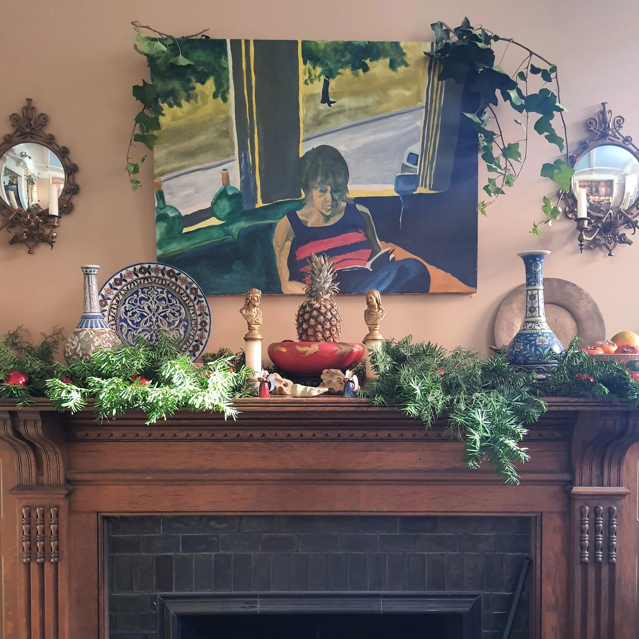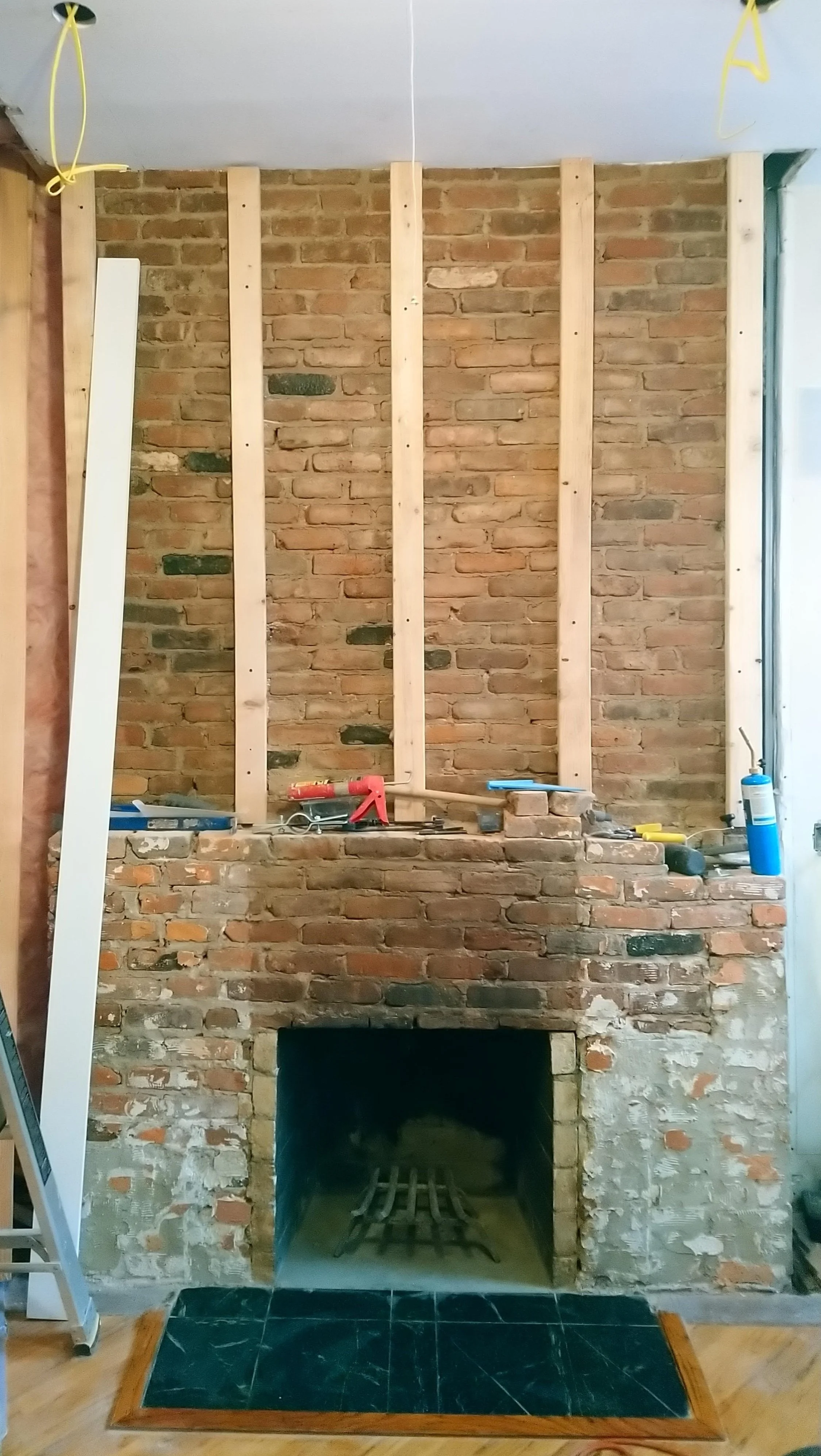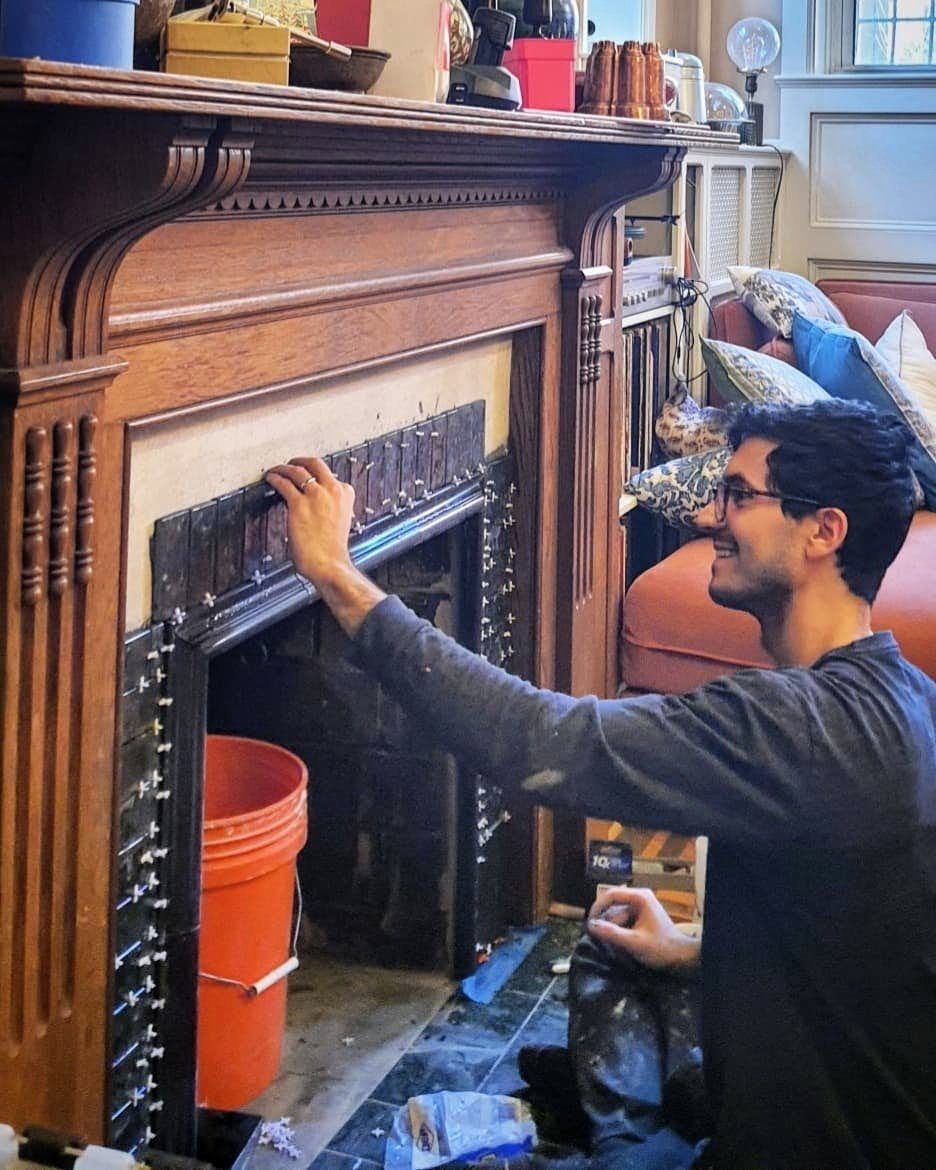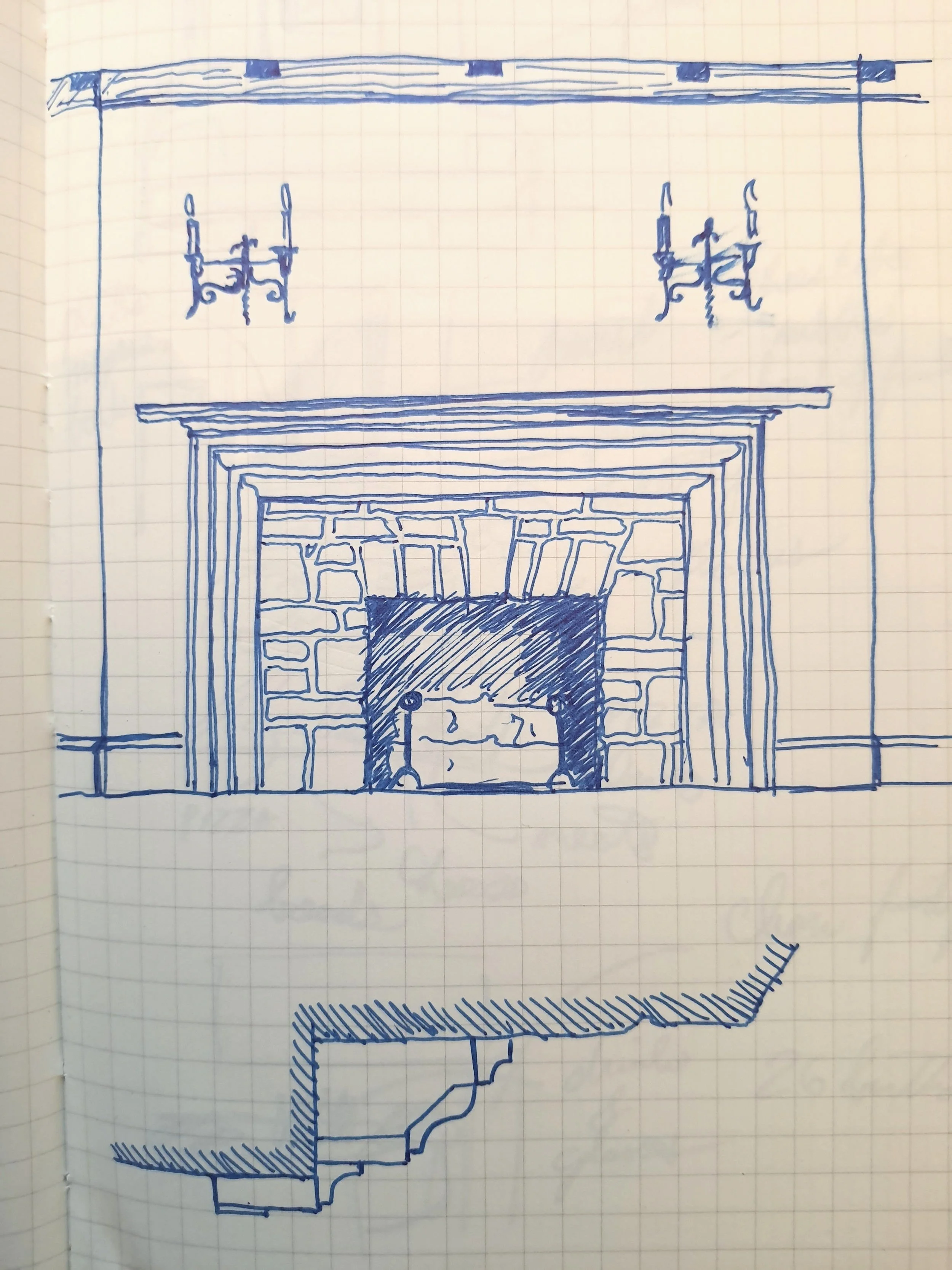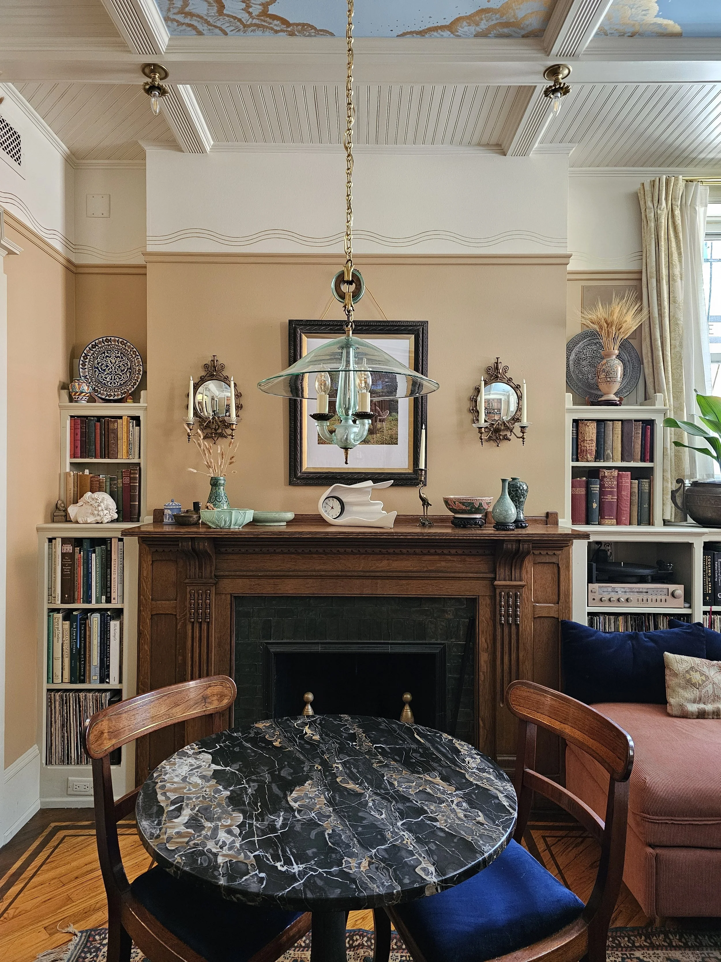 The details of the salvaged mantel provides inspiration for the adjoining built-ins.