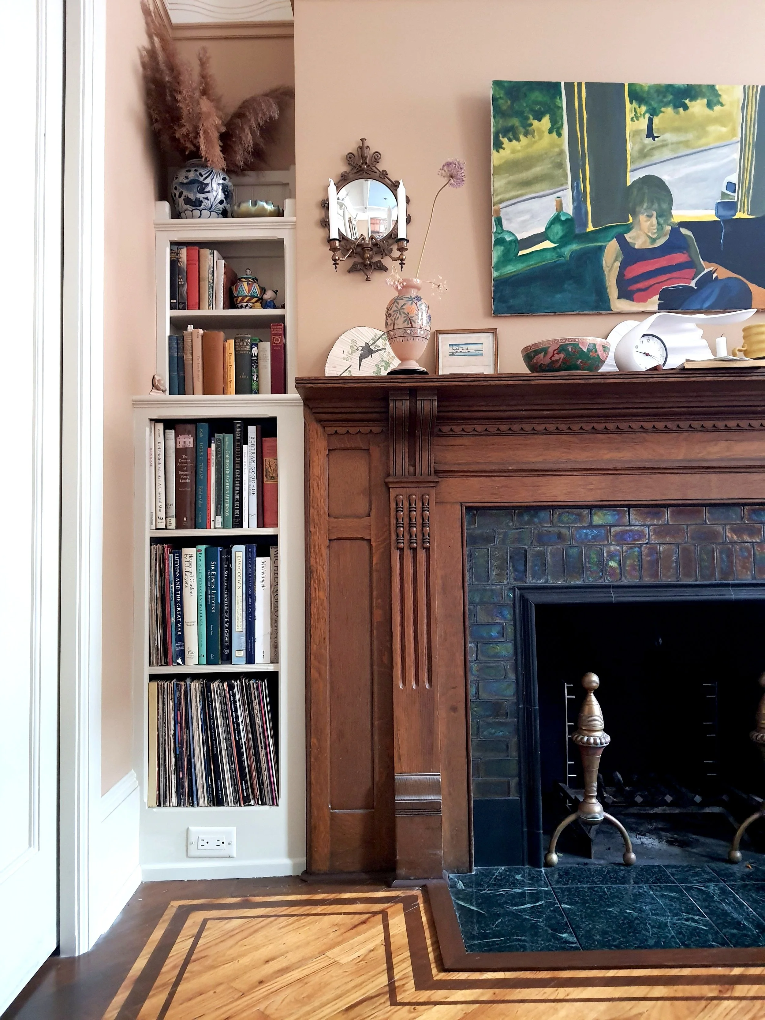 Incorporating the fireplace, shelving, and radiator into one continuous element creates visual calm.