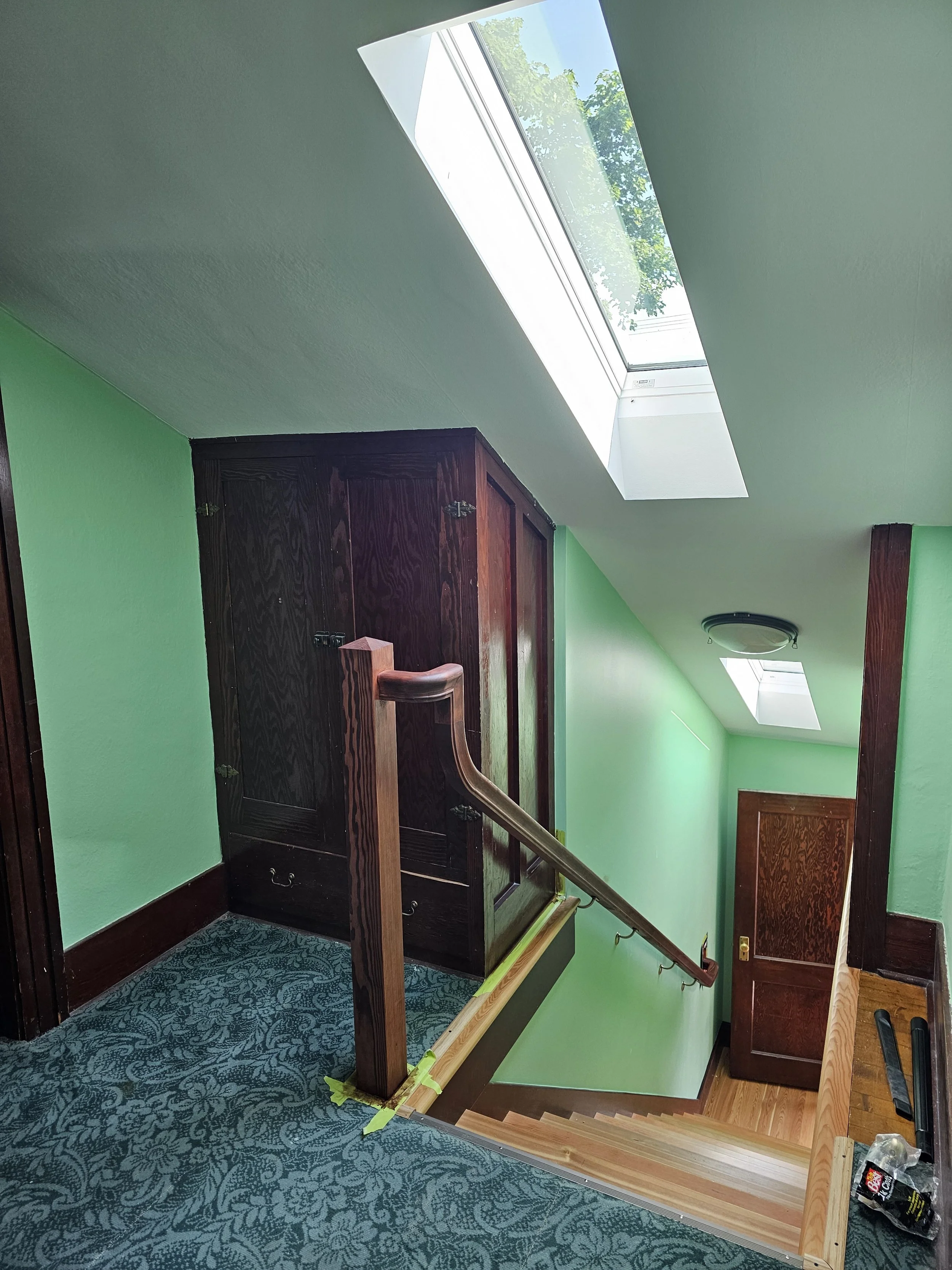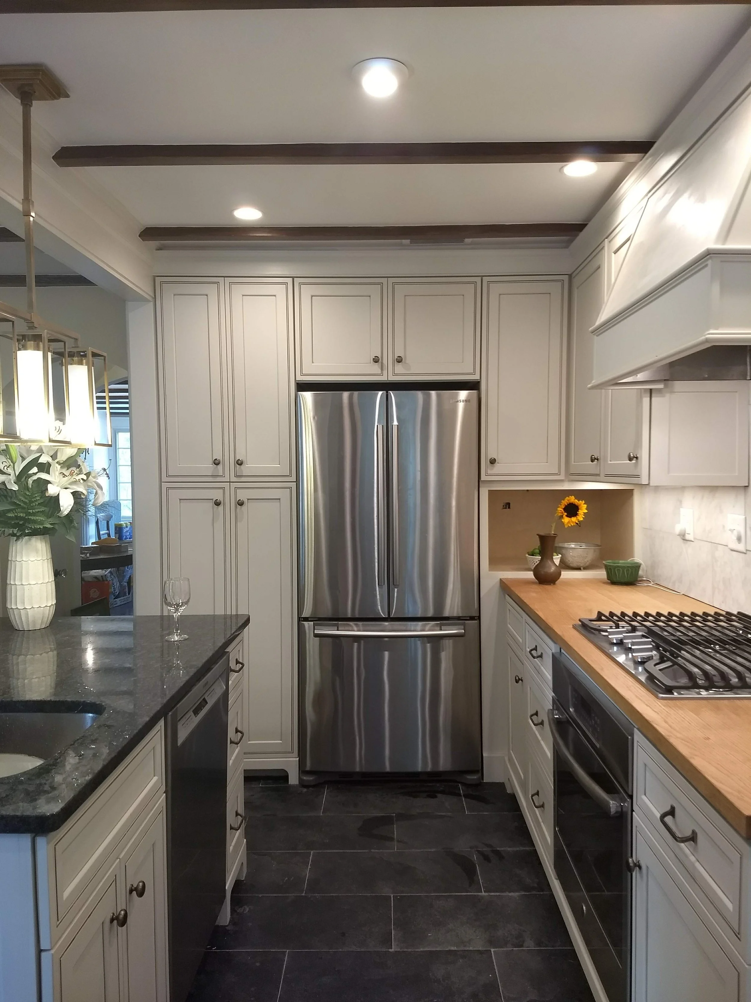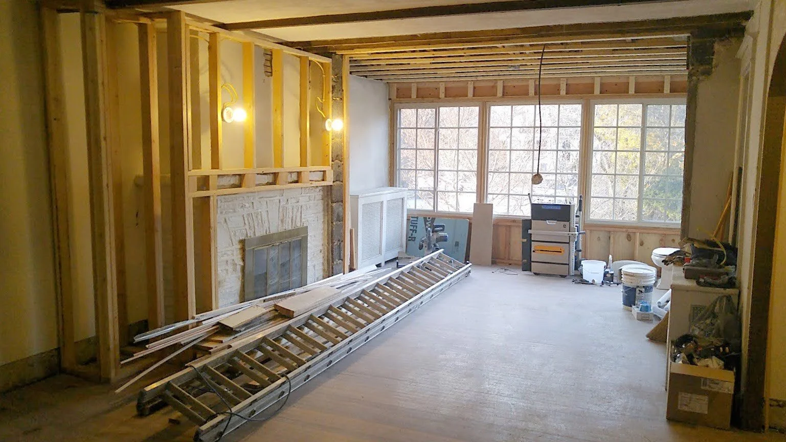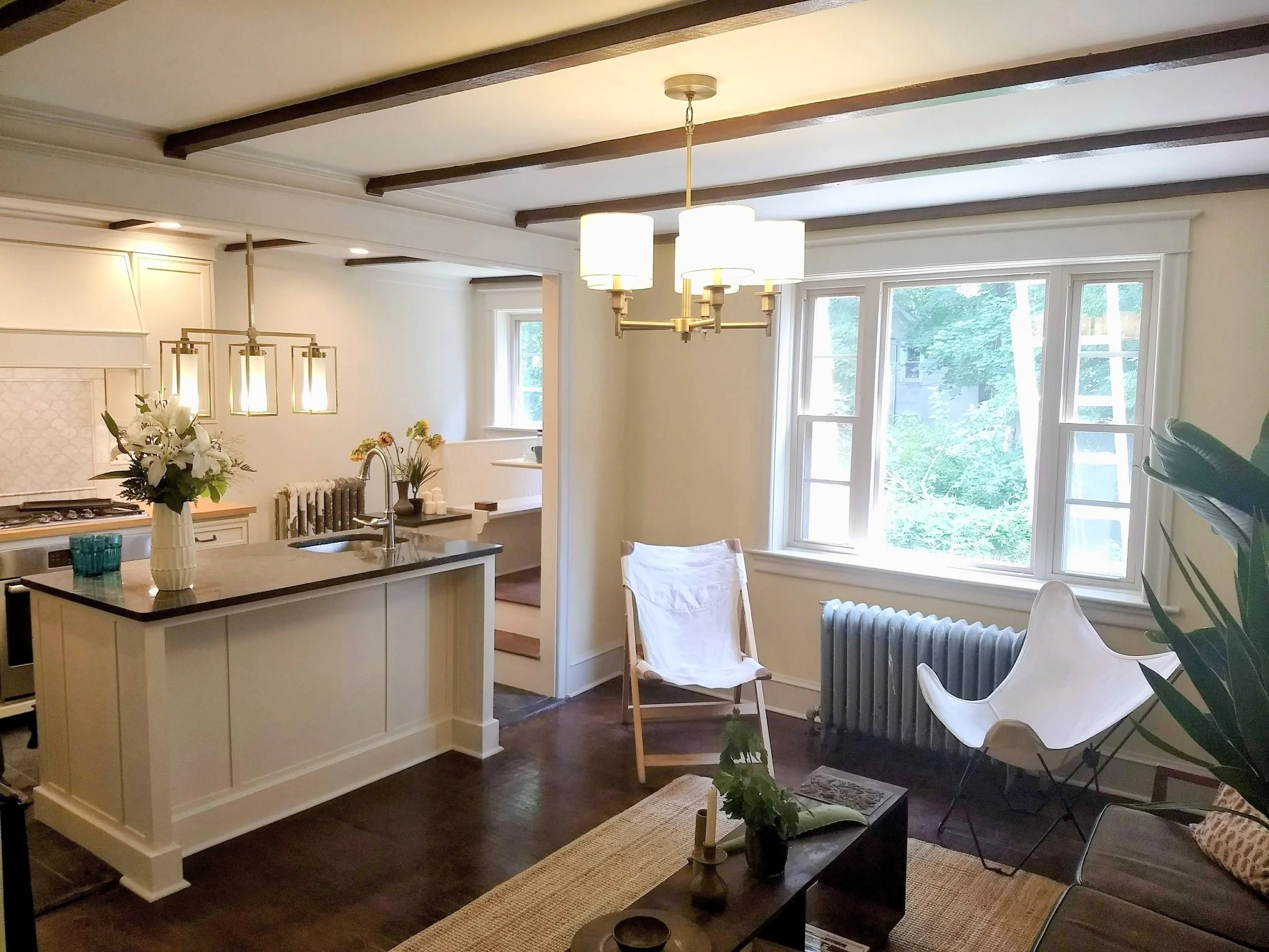 The trim of the new cased opening between the kitchen and family room matches the historic woodwork of the house.