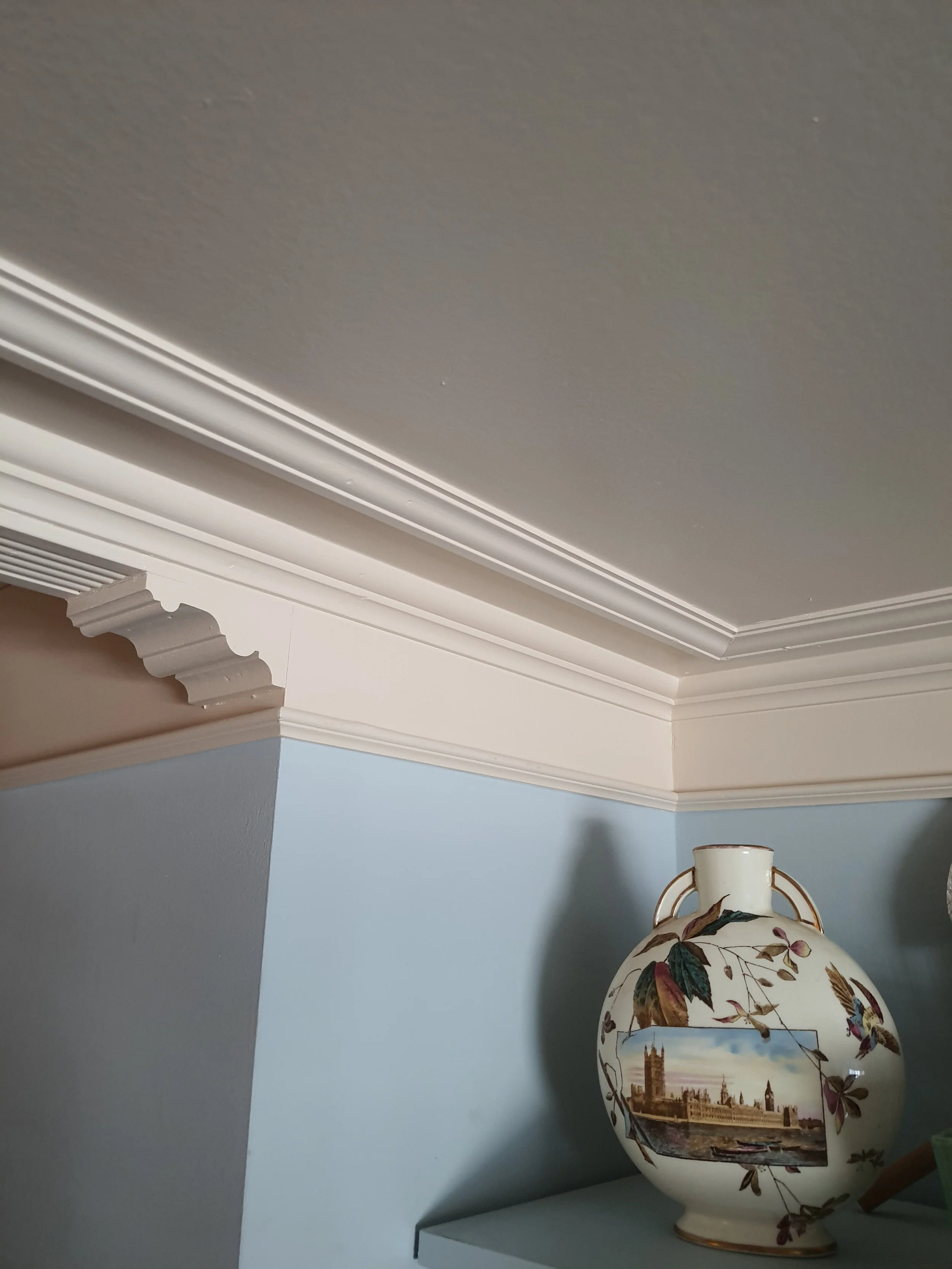 A painted grid evokes a garden trellis, creating an expansive atmosphere by blurring the boundaries of the room.